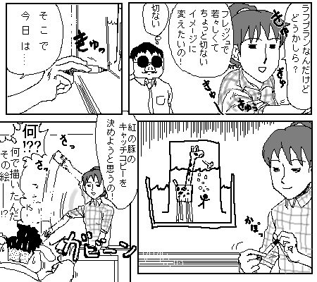 キャッチフレーズ…なんだろう「紅っ!! 紅の豚」とか?「思ったほど鼻は湿ってない 紅の豚」でもいいな。(訳分からん)