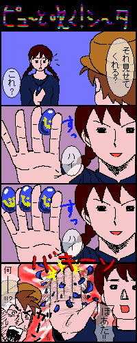 ねこきっくさんサンクス!この作品はねこきっくさんがお描きになったものです!!私が無理言って連作とさせてもらいました〜!展示する許可くださったねこきっくさんホントにマリガトウです!「ほあた!!」がすっごい効いててとってもお気に入りです(笑)